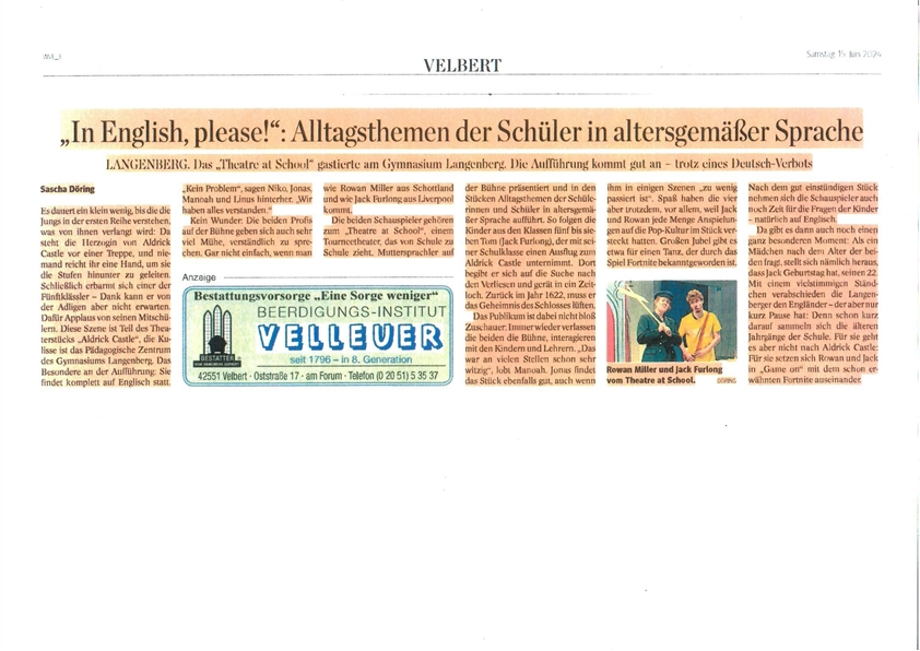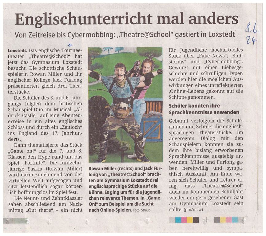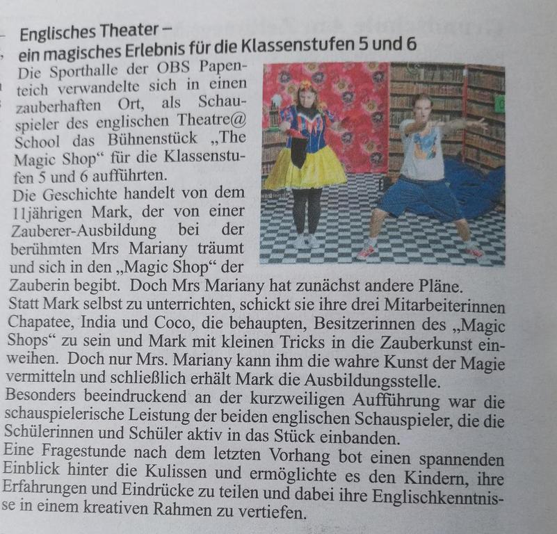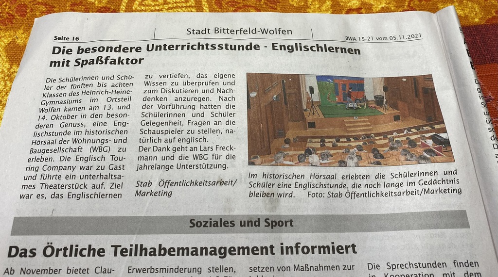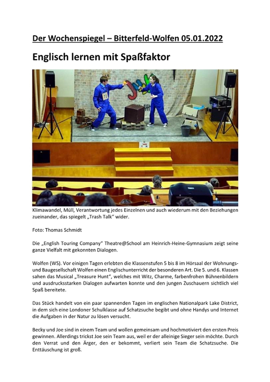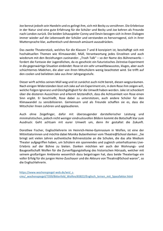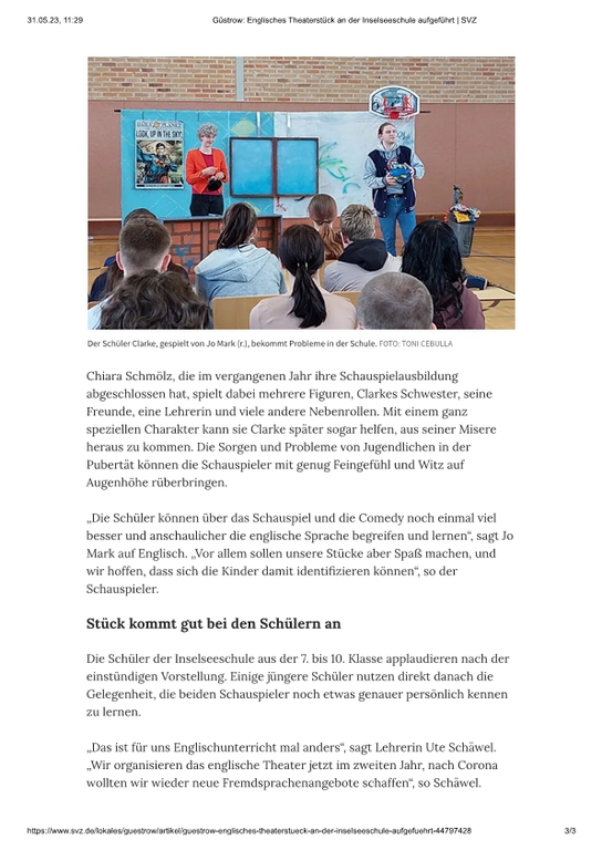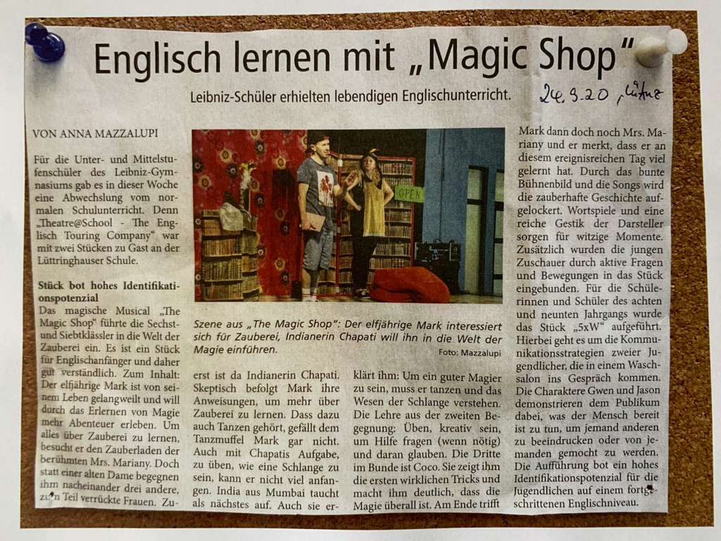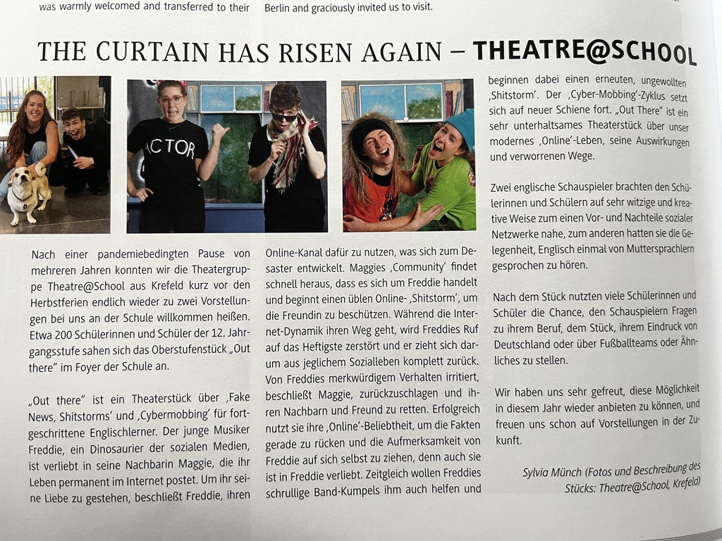Unsere Referenzen sind ein starkes Team mit großer, vielseitiger Berufserfahrung in allen Bereichen des Fremdsprachen- und Tourneetheaters, sowie die Erfolgsgeschichte des "The Flying Fish Theatre" von 2001-2015, dessen Arbeit wir als Theatre@School - The English Touring Company seit 2015 und bis heute fortsetzen und optimieren. Wir sind hoch motiviert, Sie auch?